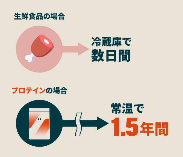 タンパク質を多く含む食材といえば、肉や魚、卵が代表的ですが、これらはほとんど生鮮食品。それに比べ、プロテインは常温で保存ができ、また未開封であれば約1.5年間*の保管が可能です。