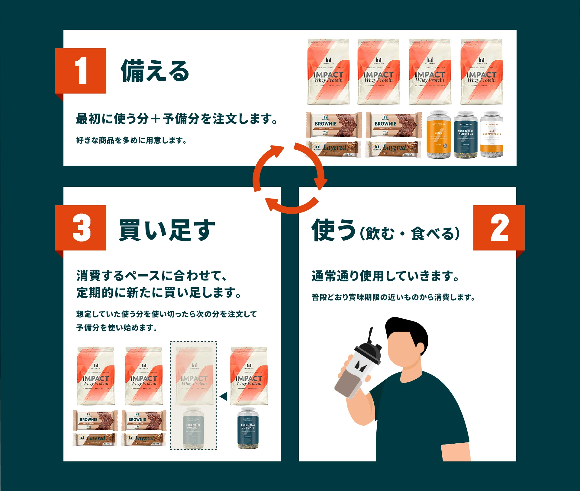 ①備える ②使う ③買い足す を繰り返し行うことで常にある一定の量を自宅に蓄え、消費しながらも有事に備えることができる無駄のない備蓄方法です。いざという時に賞味期限が切れているという心配もありません。