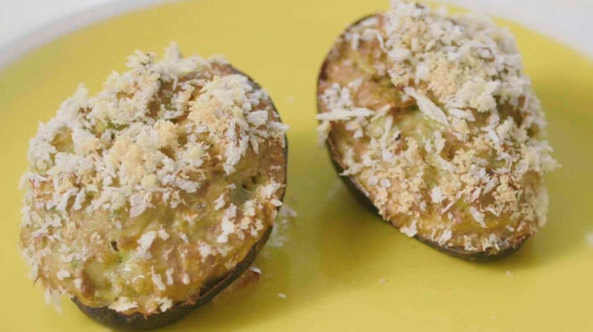 ③ アボカドの皮に②を盛り、粉チーズとパン粉をふりかける。