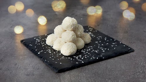 - 4の生地を1時間冷やしたあと、15個のボールに成形します。生地をさらに固めるため、1時間凍らせてからお召し上がりください。
