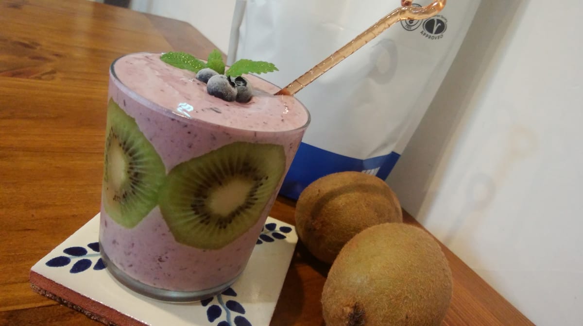 ブルーベリー:50g キウイ:1個Impactホエイプロテイン:30g 氷:50g 水:50cc