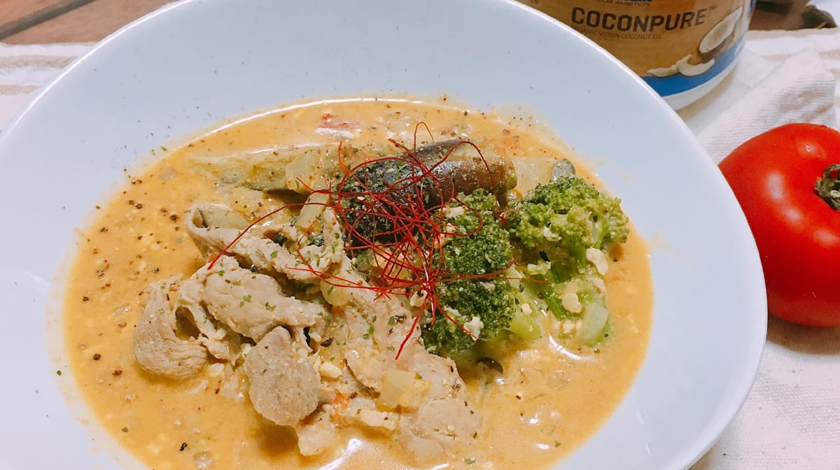 玉ねぎ:半分 なす:半分 トマト:半分 しめじ:適量 ブロッコリー:適量 豚もも肉:3枚(約60g) 豆乳:120ml ココンピュア(ココナッツオイル):小さじ1 コンソメ:1個 カレー粉:小さじ1Impactホエイプロテイン(ノンフレーバー):1/2スクープ 塩胡椒:お好みで