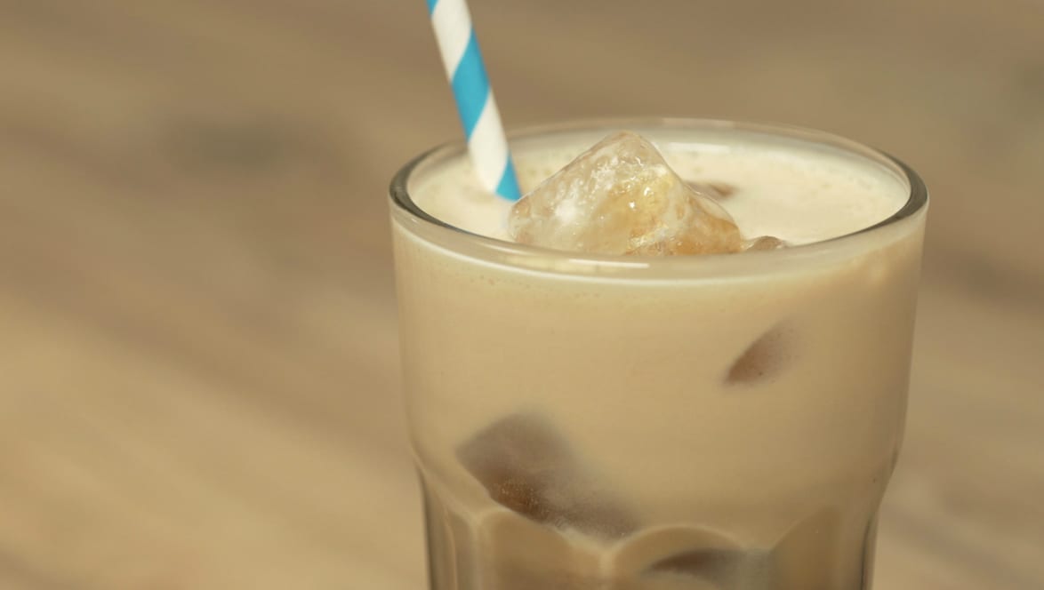 Impact ホエイ プロテイン(ミルクティー)と牛乳をブレンダーに入れ、全体が滑らかになるまで混ぜる - コップに氷を入れ、1.で準備したエスプレッソをそそぐ