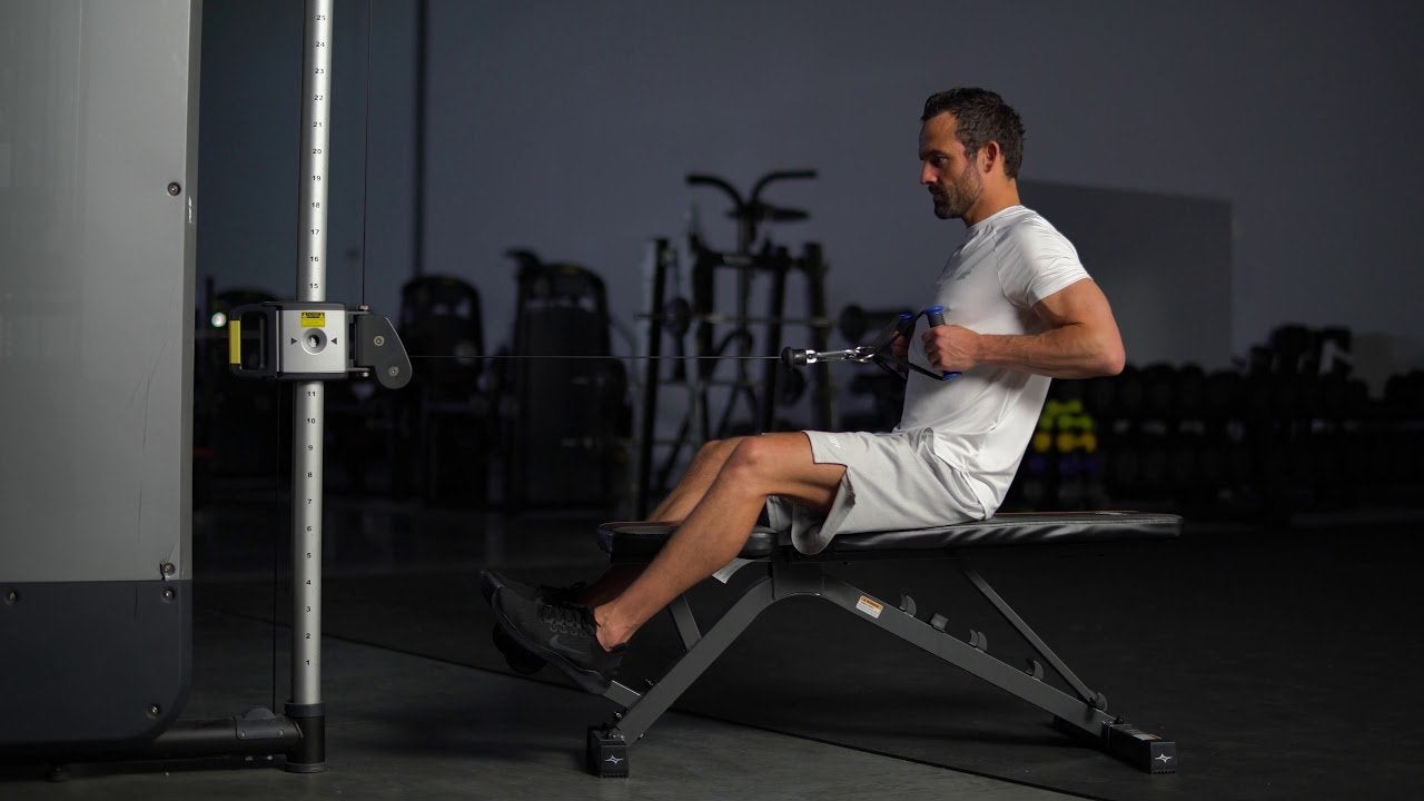 プル(引く動作)がメインとなる種目で、上半身最大の筋肉である広背筋を鍛えるのに特に効果があります。菱形筋、僧帽筋、二頭筋にも効果があり、シーテッドケーブルローは背中を鍛えるにはパーフェクトなトレーニングです。